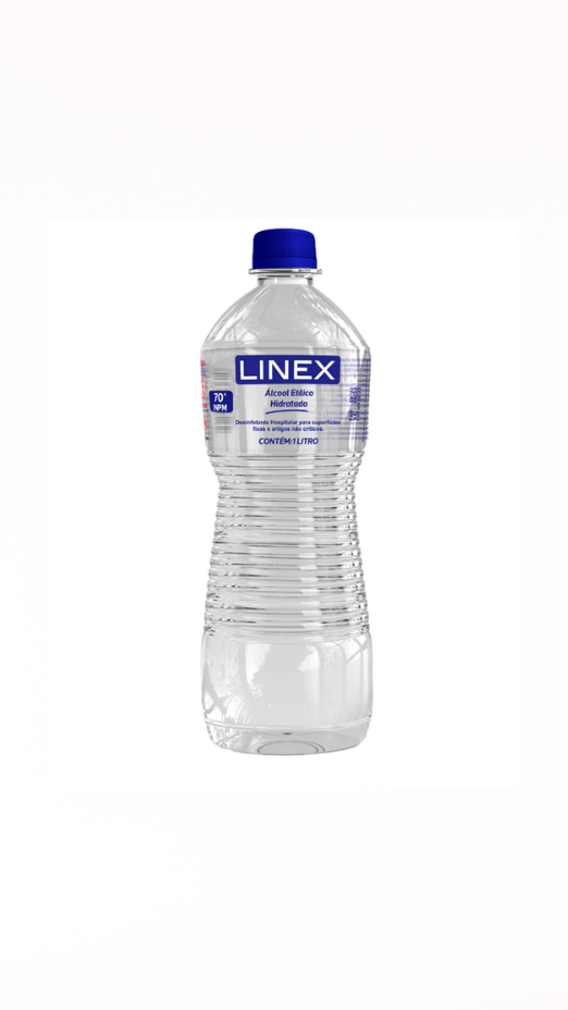 Álcool etílico 70% INPM Linex, frasco de 1 litro. Ideal para higienização das mãos e desinfecção de superfícies, com ação antisséptica eficaz contra vírus e bactérias.